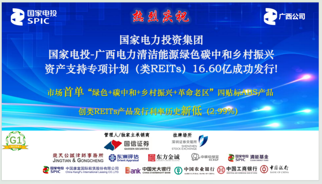 3月1日,国家电投在深交所成功发行“国家电投-广西电力清洁能源绿色碳中和乡村振兴支持专项计划(类REITs)”,发行规模16.60亿元,发行成本2.99%,刷新类REITs产品自诞生以来成本最低纪录,实现国家电投2024年类REITs业务开门红。