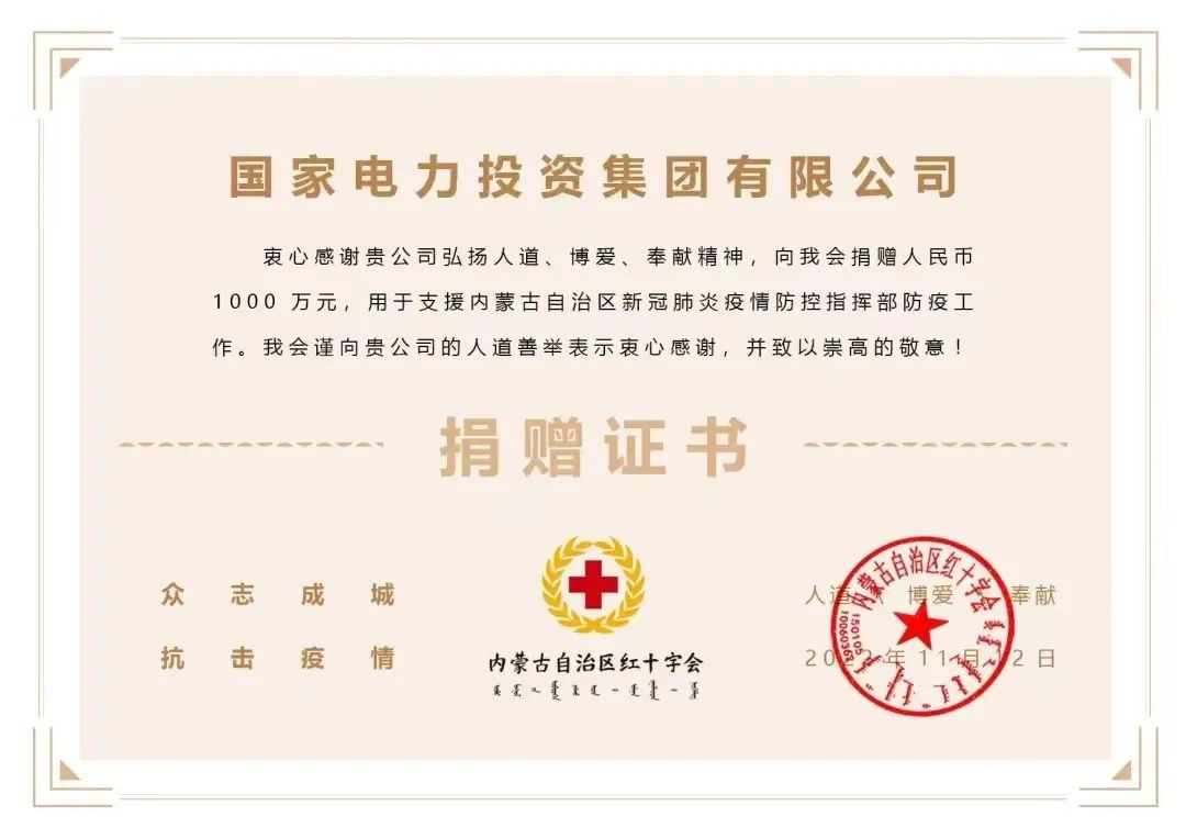 在内蒙古自治区抗击新一轮新冠肺炎疫情的紧要关头,11月12日,国家电投由成员单位内蒙古能源有限公司为代表通过自治区红十字会向自治区捐赠抗击新冠肺炎疫情资金1000万元,用于支援自治区新冠肺炎疫情防控指挥部防疫工作,为全区疫情防控工作提供支持和保障。