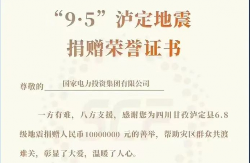 国家电投捐款1000万元全力支援四川泸定地震抗震救灾
