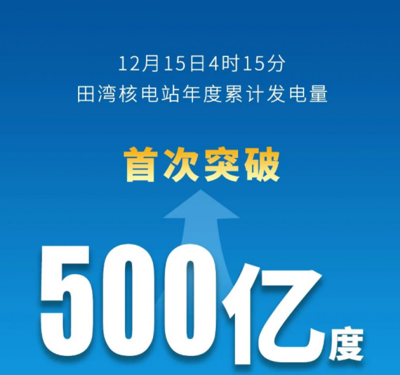 12月15日4时15分,中国核电旗下田湾核电站年度累计发电量首次突破500亿度,创田湾核电站年度发电量历史新高,实现年度发电量六连增。