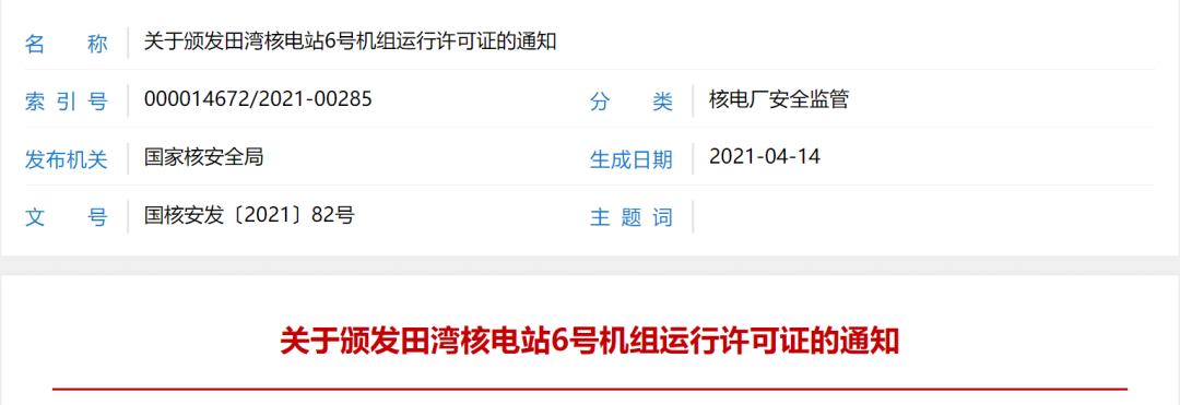 国家核安全局颁发田湾核电站6号机组运行许可证