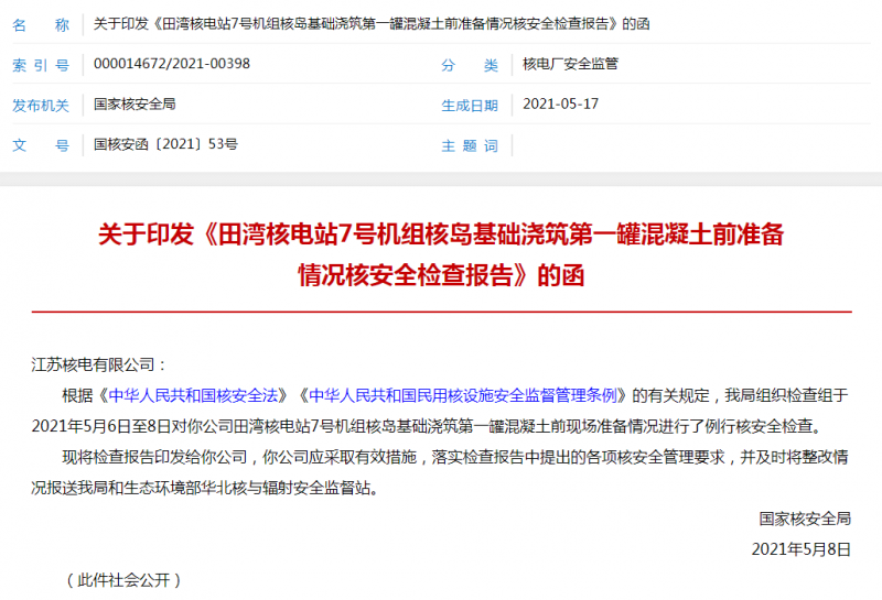 根据《中华人民共和国核安全法》《中华人民共和国民用核设施安全监督管理条例》的有关规定,我局组织检查组于2021年5月6日至8日对你公司田湾核电站7号机组核岛基础浇筑第一罐混凝土前现场准备情况进行了例行核安全检查。