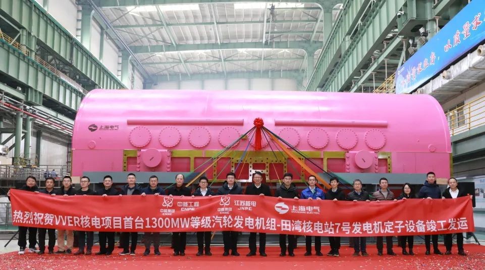 1月10日上午,田湾核电站首台1300MW汽轮发电机定子竣工发运仪式在临港工厂举行,电站集团副总裁沈兵,江苏核电有限公司工程总经理许建华、中国核电工程有限公司设备成套中心副总经理田宜等出席。此次发运,标志着电站集团自主设计并拥有知识产权的1300MW等级核电发电机正式迈入批量化生产阶段。