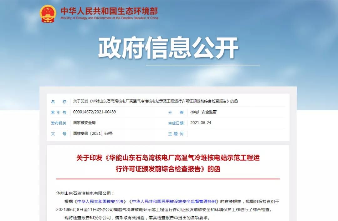 近日,生态环境部华东核与辐射安全监督站(以下简称华东监督站)组织检查组对华能山东石岛湾核电厂(以下简称石岛湾核电)高温气冷堆核电站示范工程首个NSSS(核蒸汽供应系统模块)离开15%PFP(核电厂额定电功率)控制点进行了检查。