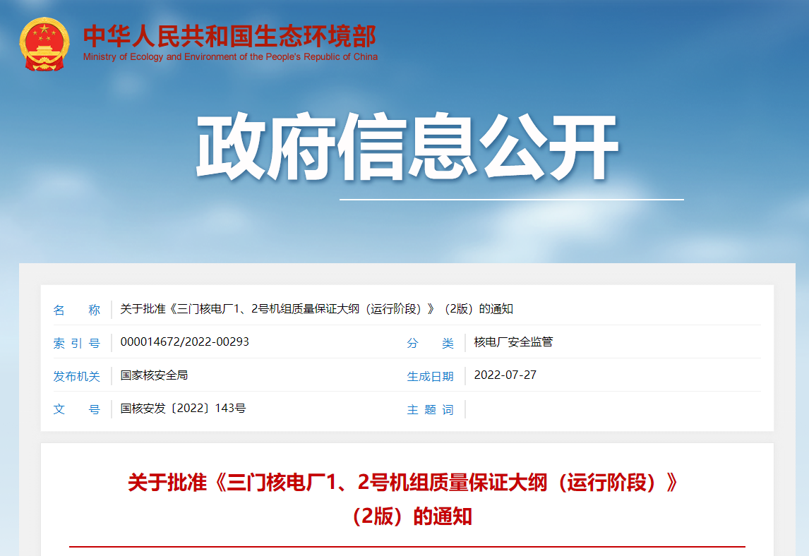 关于批准《三门核电厂1、2号机组质量保证大纲(运行阶段)》(2版)的通知