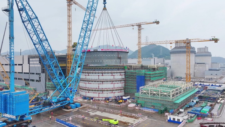 在中国浙江省三门核电站3号机组,构成主安全壳壁的三个钢环已吊装到位。上海核工程研究设计院 (SNERDI) 宣布,三根吊环的安装于 6 月 5 日完成。每根吊环壁厚约 4.5 厘米,内径约 39.6 米,总高约 11.6 米。总吊装重量约 826 吨。上海核设计院表示,除在壳体上安装临时加固筋、附件板、导风支架、导向装置、吊耳等外,还提前安装管线、电气、通风、钢结构、电动绞车等,进一步节省岛内项目安装时间,降低交叉作业风险,提高现场工作效率。2021 年 4 ...