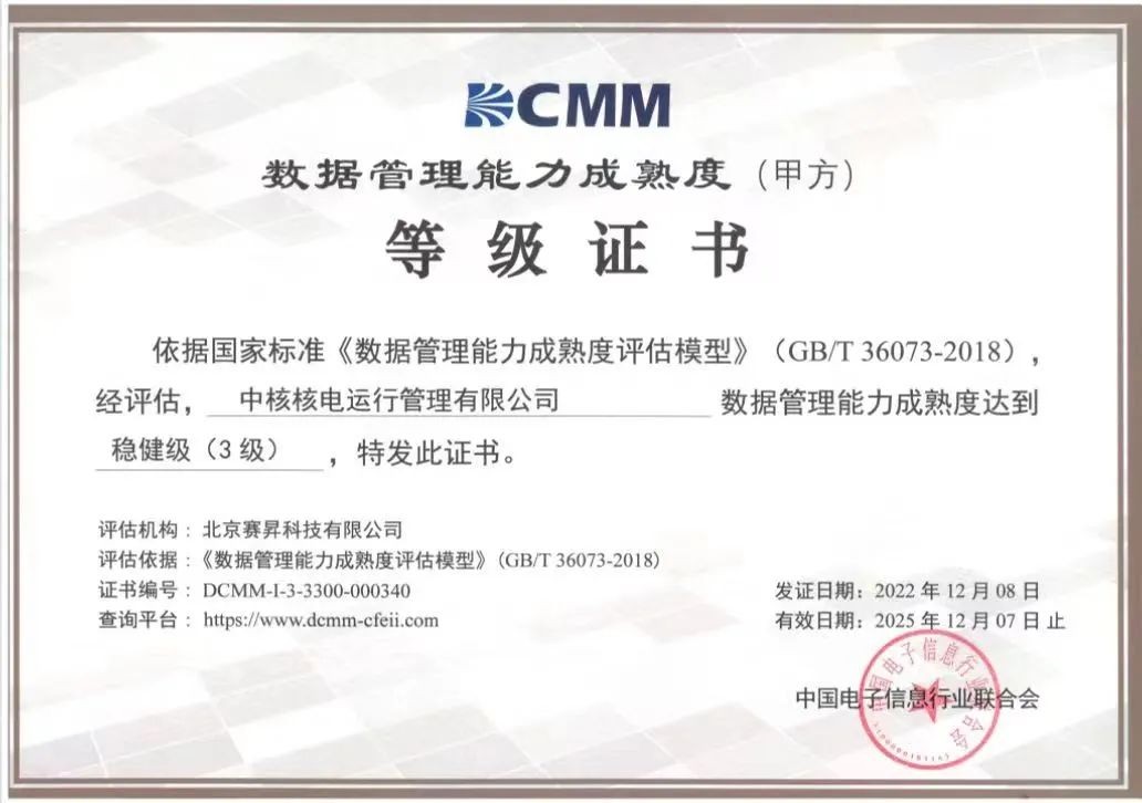 近日,中国电子信息行业联合会公布了数据管理能力成熟度(DCMM)等级证书的企业名单(第十二批),秦山核电通过DCMM稳健级(3级)认证,公司数据管理体系理论与建设实践通过国家标准检验,达到国内行业领先水平,标志着公司数字化转型建设迈上新台阶。