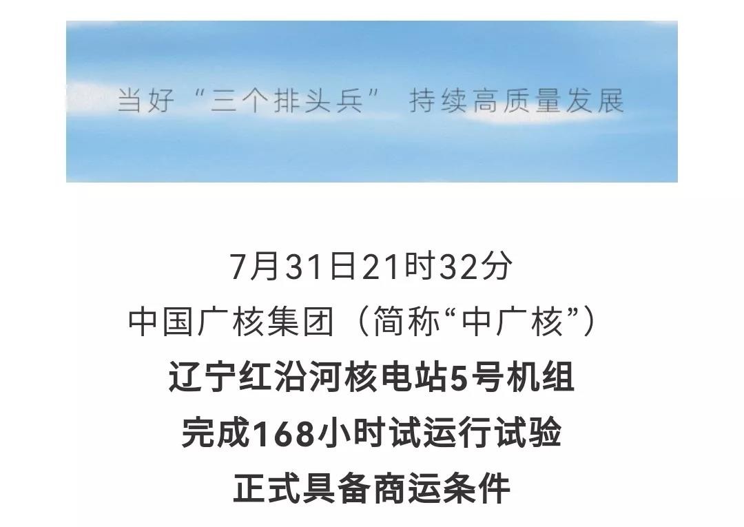 7月31日21时32分,辽宁红沿河核电站5号机组完成168小时试运行试验,正式具备商运条件,我国运行核电机组增至51台。根据测算,1-5号机组全部投产,年上网电量可达375亿度,环保效益相当于等效减少标煤消耗约1130万吨,减排二氧化碳约3120万吨。